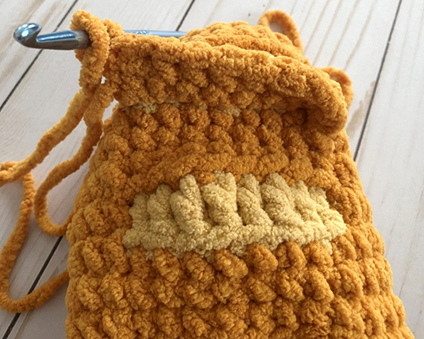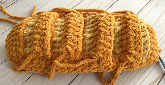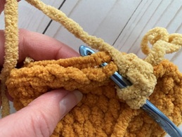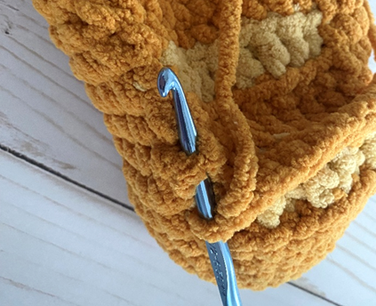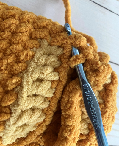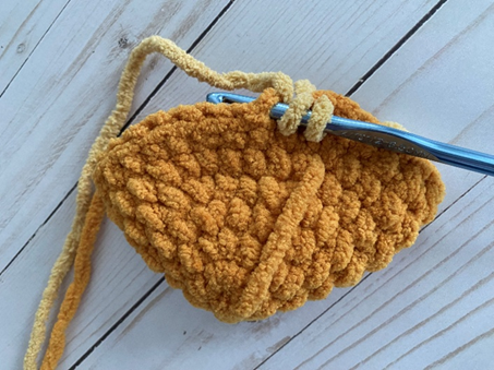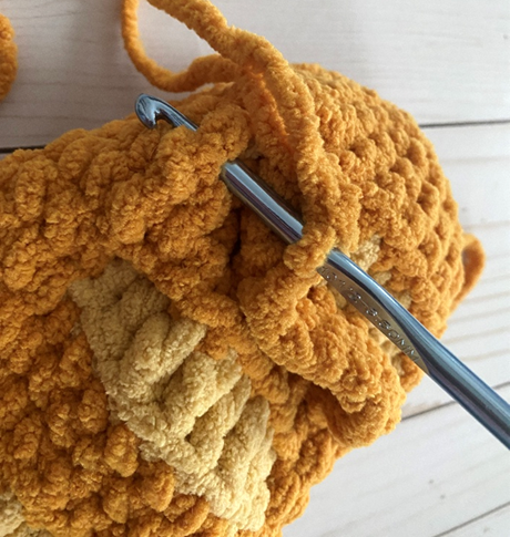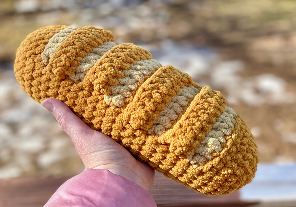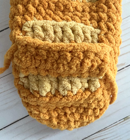 Bulky weight (6) Chenille yarn in gold – 60 yds (Big Twist Cuddle in Gold used in photos; alternatives include Big Twist Baby Bear and Bernat Blanket)