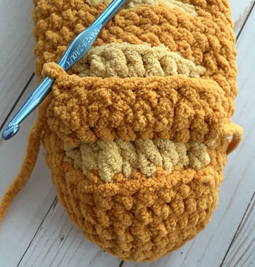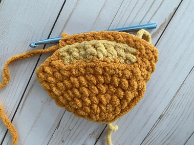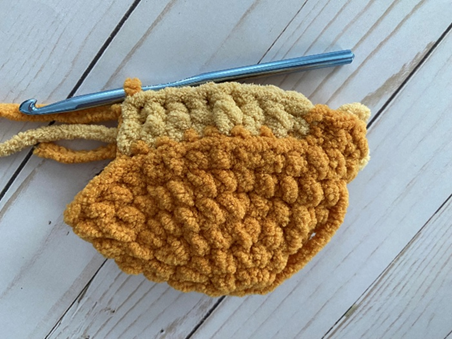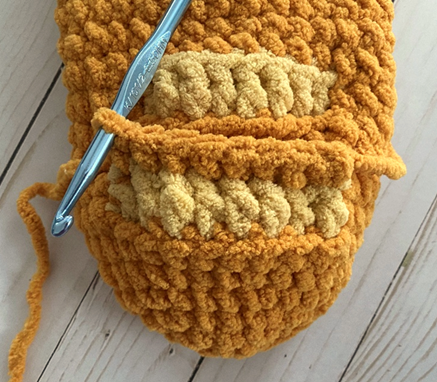 Rnd 8 – sc in next 2 sts, change to beige yarn in second st. Working in BLO (first photo below), dc in next 8 sts (second photo). Change back to gold yarn in eighth st. Working through both loops again, sc in rem sts. (22 sc, 8 dc, 30 total sts)