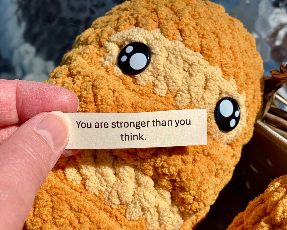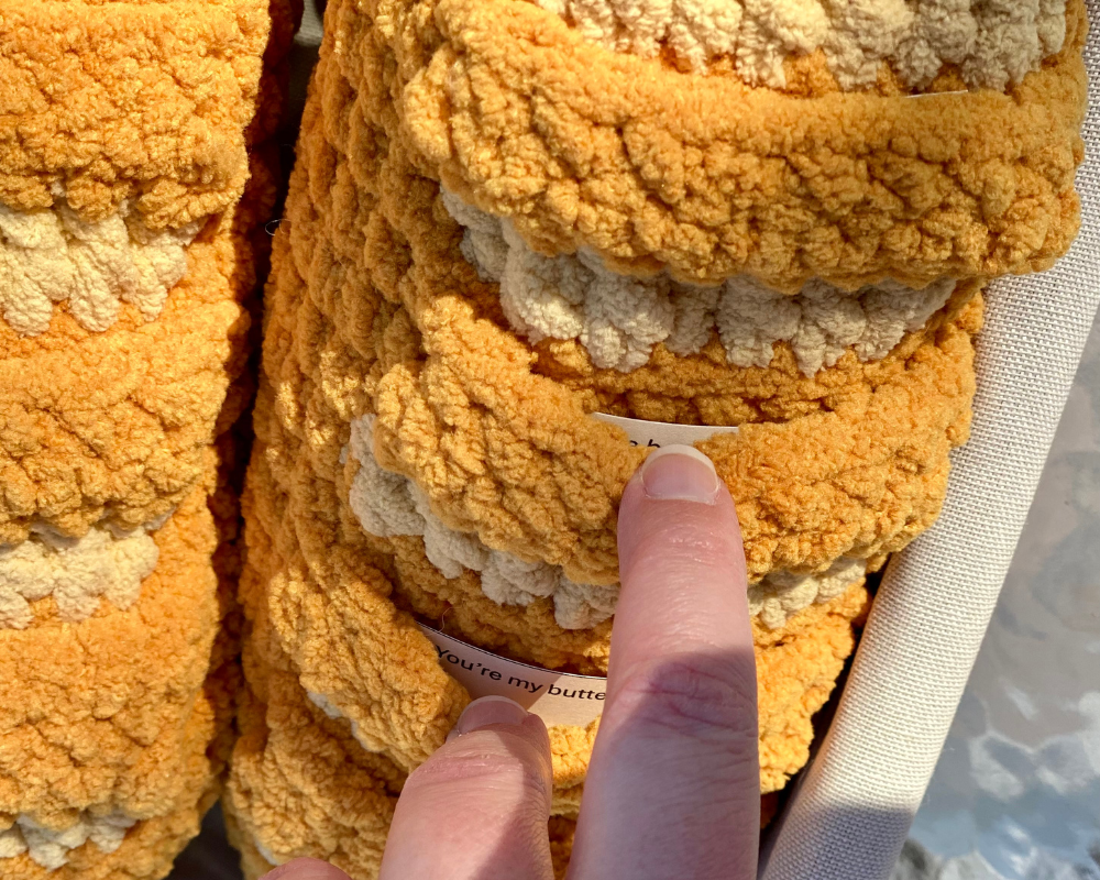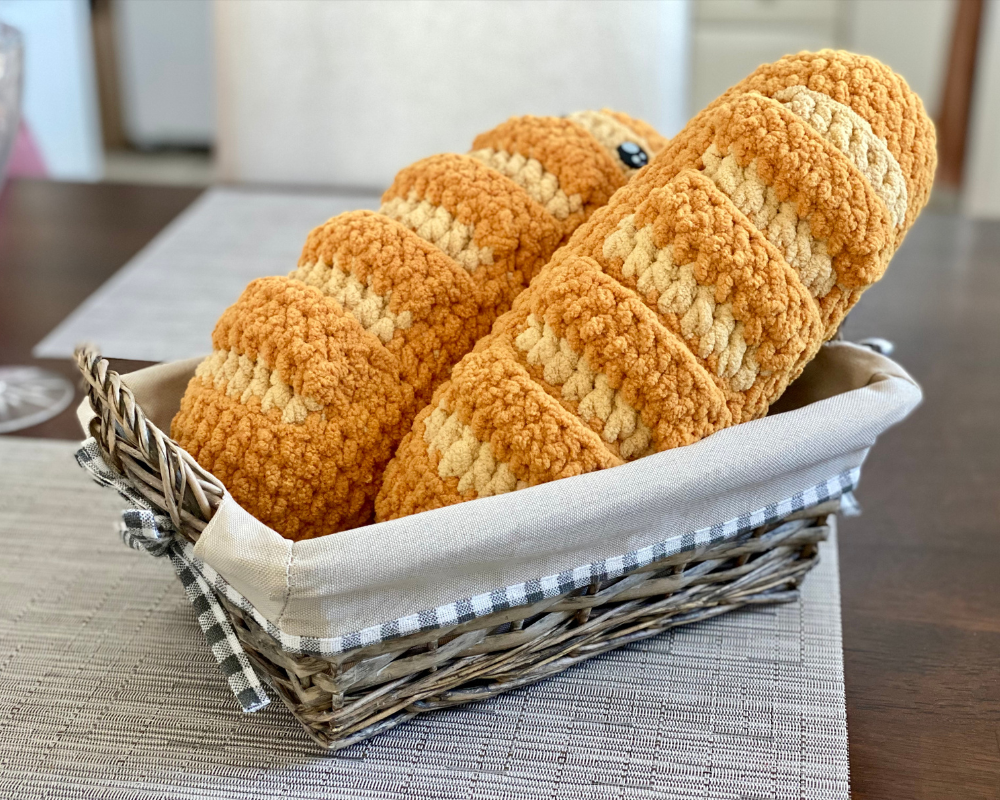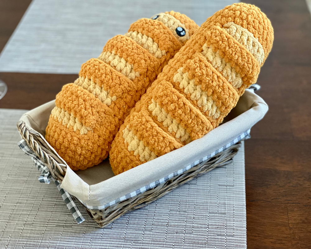 I’m so excited to share the first pattern from my new crochet collection, Comfort Carbs! This design is inspired by Emotional Support Nuggets (based on my Chicky Nuggies pattern). My “basket” of nuggets is a craft fair bestseller at the shows I attend, so I thought I’d expand to include some warm, cozy breads that offer some humor and positive thoughts, too!
