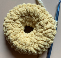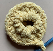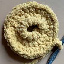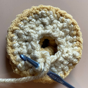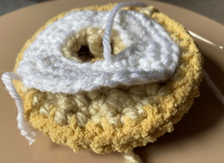 Rnd 6 – Working in BLO (sixth photo below), rep rnd 4 (seventh photo below). (30 sc) (Optional: add safety eyes to one Bagel Half a few sts apart between rnds 4 and 5.)